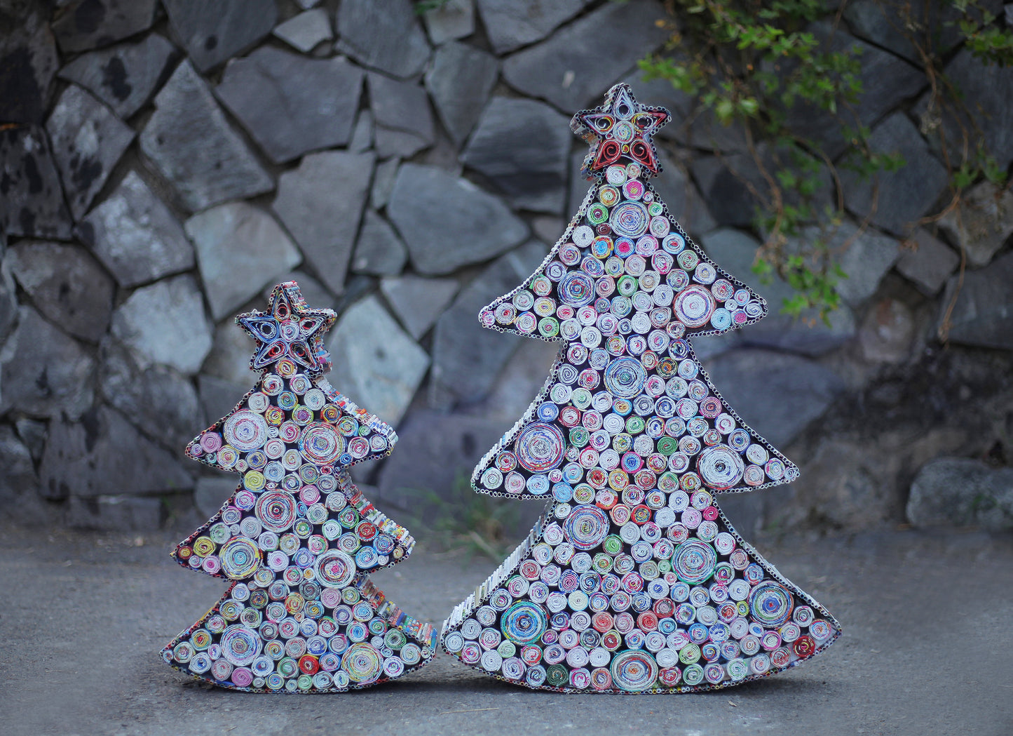 Product features a Christmas tree shape filled with small, tightly wound circles of magazine paper. Each tree has three tiers of swooping branches, and a star on top. As these products are made from recycled materials, they will always look slightly different from one another. This product comes in three sizes.