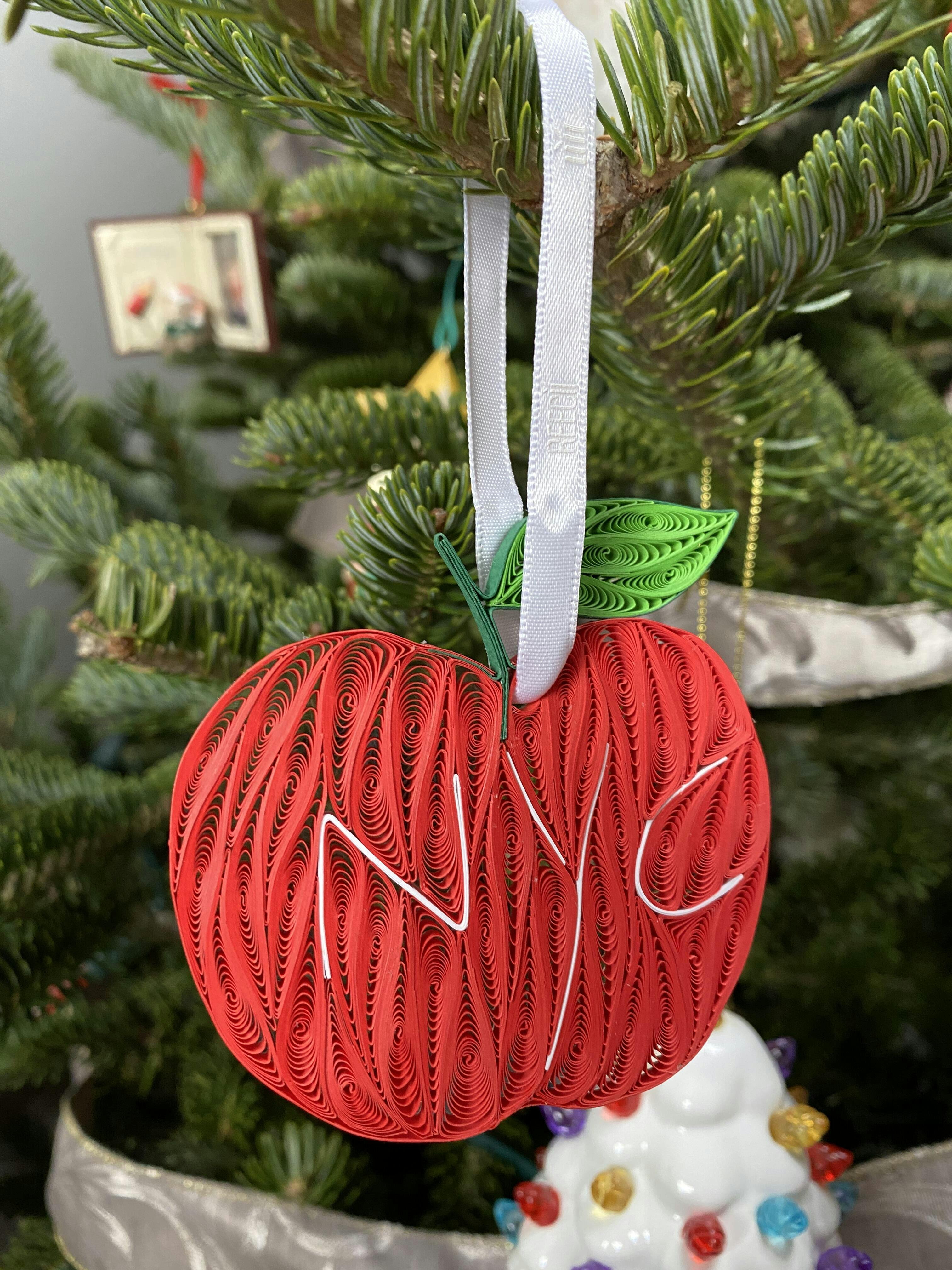 Product features a red apple made from quilling paper. The top of the apple has a light green stem with a single bright green leaf connected to it. White paper has been used to make the letters N Y C across the middle of the apple.