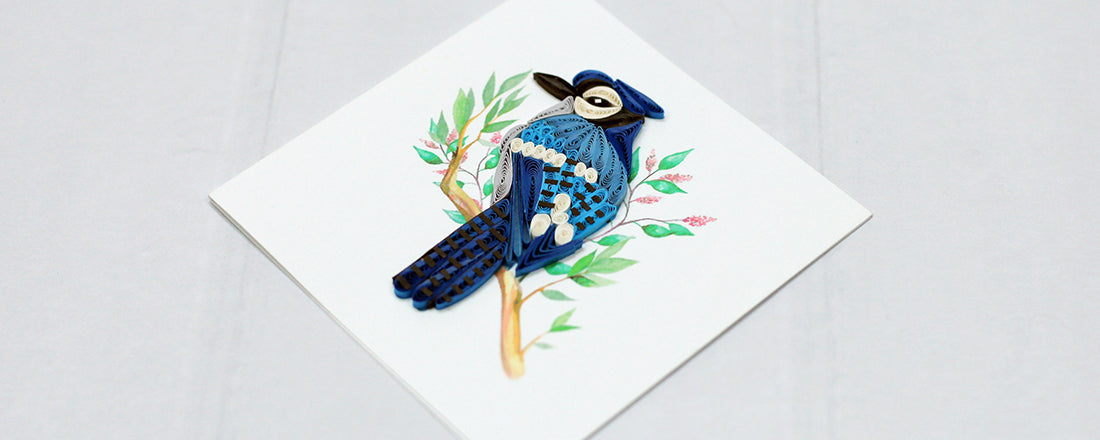 Product features the image of a blue jay perched on a branch centered on a white greeting card. The blue jay is made from quilling paper and has a dark blue head, wing tips, and tailfeathers while its body is light blue. It has a black beak and black accents for its eye and back feathers. The branch is inked in light brown and has bright green leaves and stems growing out of it. Small pink blossoms grow from the ends of some of the stems.