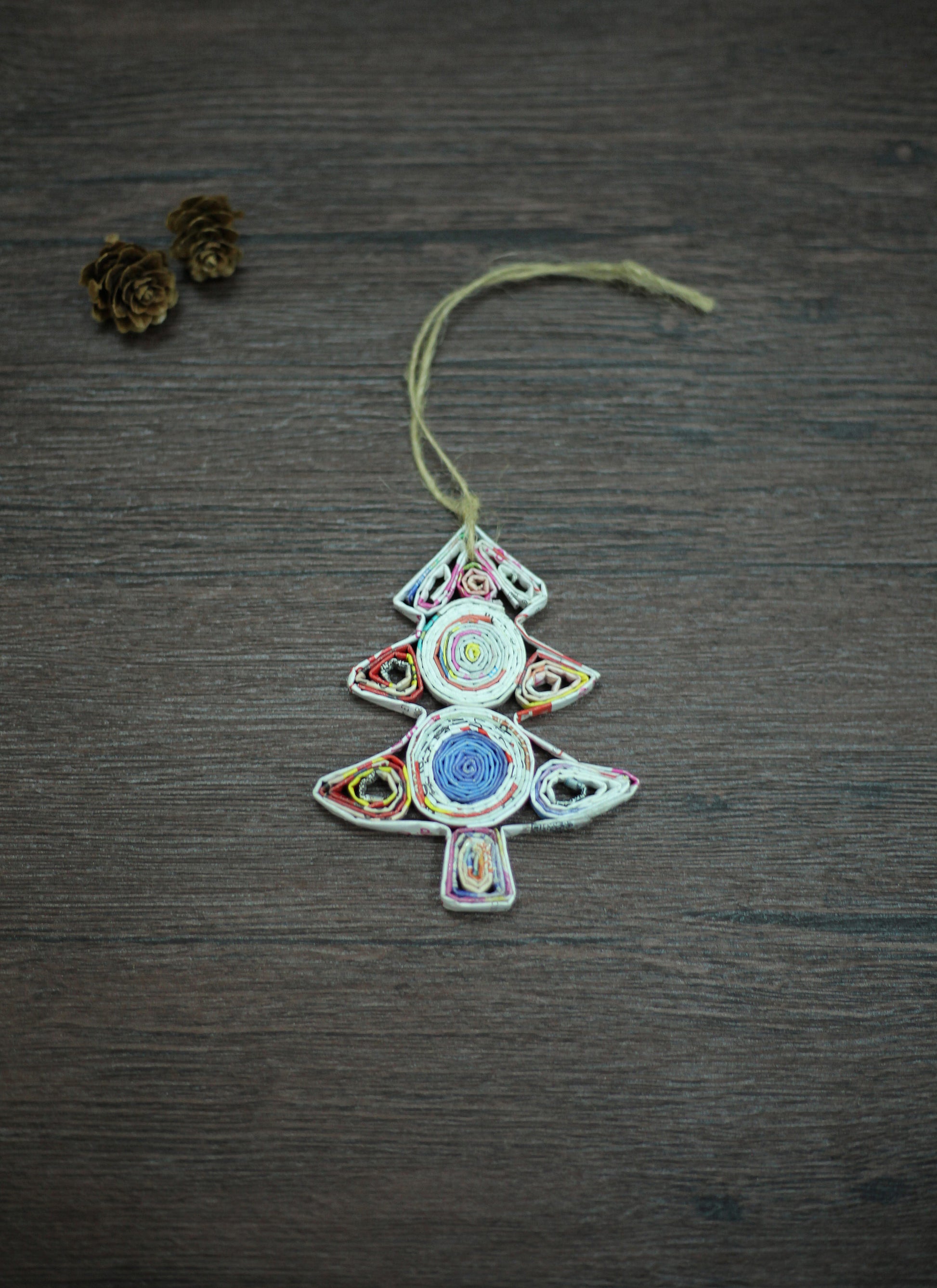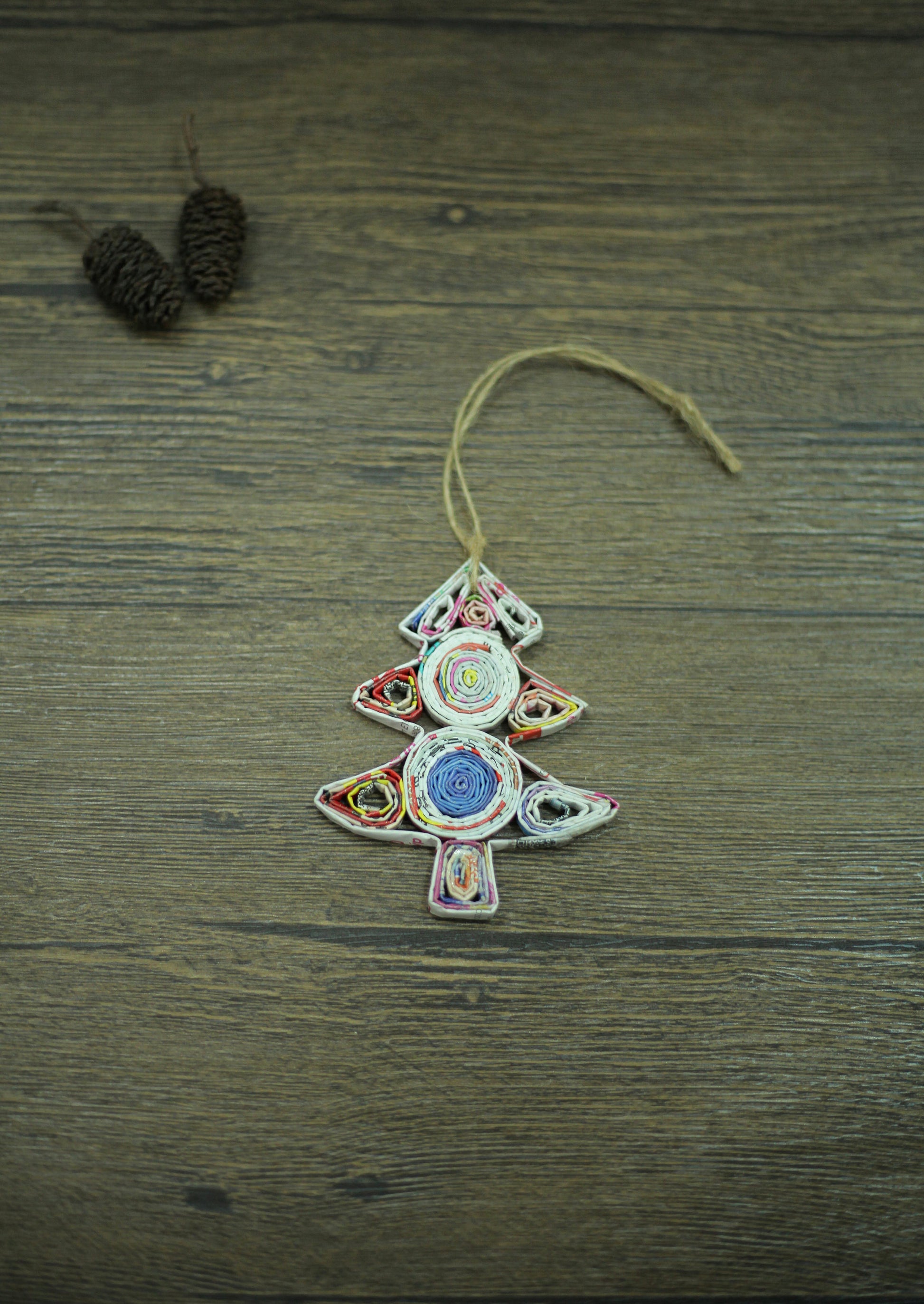 Product features an evergreen tree shaped from recycled paper. The interior of the ornament has swirls and curved line accents that end in tight coils resembling Christmas ornaments. As these products are made from recycled materials, their colors will always look slightly different from each other.
