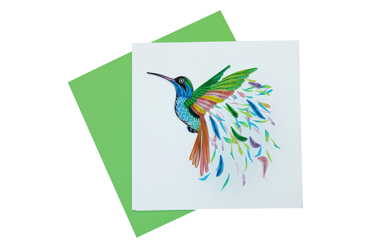 Product features a colorful hummingbird centered on a white background. The hummingbird has its wings outstretched and is shedding a cascade of feathers as it flies. The body of the hummingbird is primarily blue and teal with green accents, while the feathers on the wings are light green and orange with yellow and pink accents. The tail feathers and beak are orange. The hummingbird and all its feathers are made with pleated quilling paper, while the shed feathers are rendered with ink.