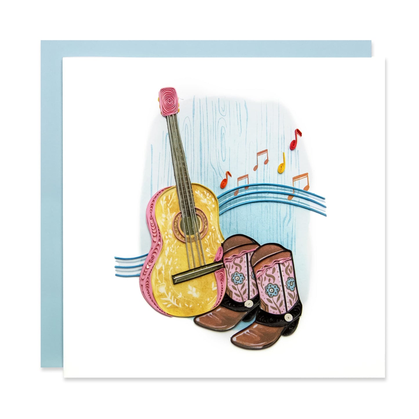 Product features a white greeting card with an acoustic guitar, cowboy boots, and a staff of music floating through the background. The guitar is outlined in quilling paper and has pink quilling paper accents along its outer edge and at the head of the guitar. The music notes floating off of the staff are made of red, orange, and yellow quilling paper, and the cowboy boots are outlined in paper and filled with ink. The space behind the guitar and music has been inked in light blue to resemble wood paneling.