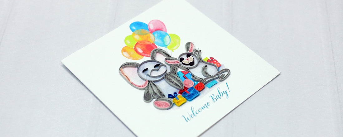 Product features a white greeting card with an elephant and mouse in the center, waving towards the viewer. There are presents stacked between and behind the pair, and a collection of balloons above them. The elephant and mouse are outlined in quilling paper and have intricate accents on their feet, ears, and hands. The presents are rendered in yellow, blue, and red quilling paper. The words “Welcome Baby!” are written in the bottom center of the card in a flowing blue cursive.