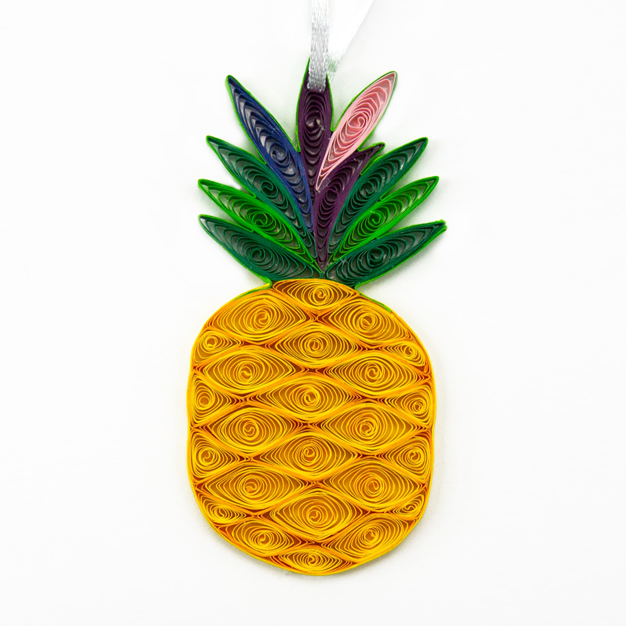 Product features a pineapple-shaped ornament. The pineapple is made from yellow quilling paper in swirling patterns, and the leaves are made from green, dark blue, dark purple, and pink paper.