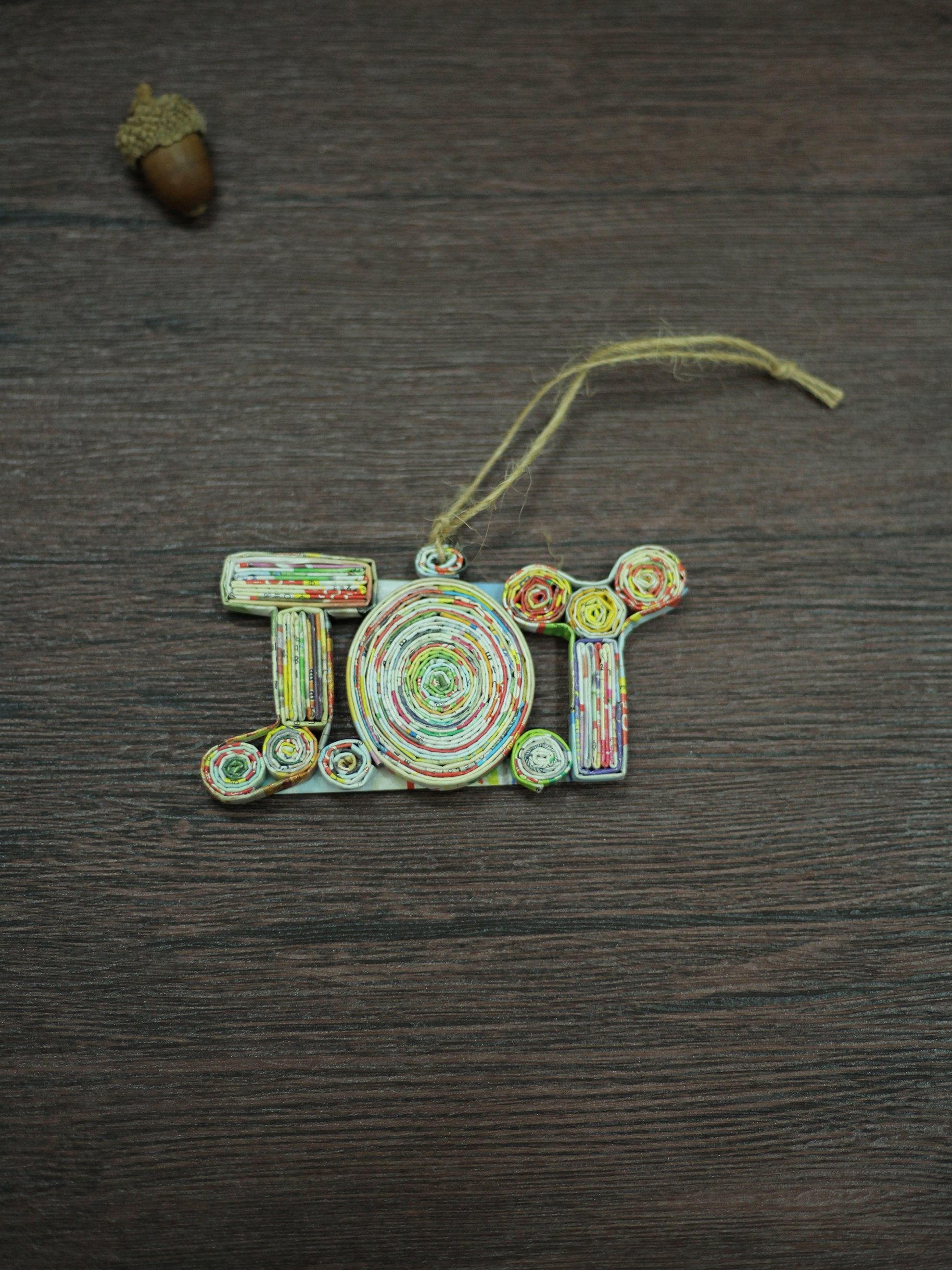 Sometimes, we all need a little extra joy. This handmade ornament may be just the thing – whether you need a new piece of art for your own space or want to send some positivity to a dear one! Made from recycled paper, this ornament is sure to help you bring a little joy!