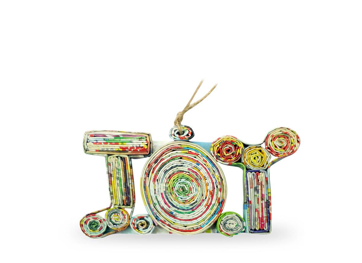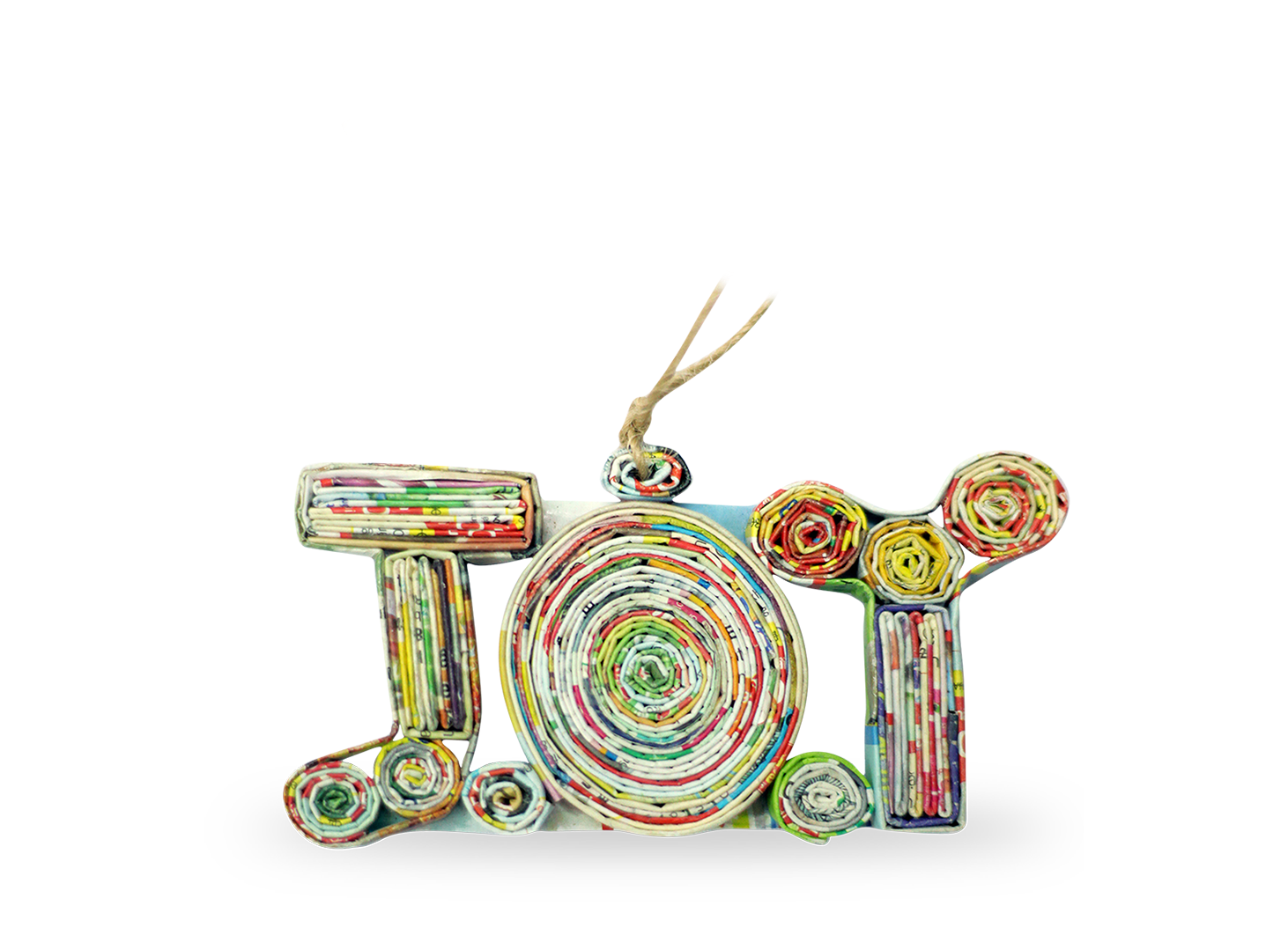Product features the word JOY made from recycled magazine paper. Each letter is rendered in a blocky style made from tightly pressed and wound strips of paper. As these products are made from recycled materials, their colors will always look slightly different from one another.