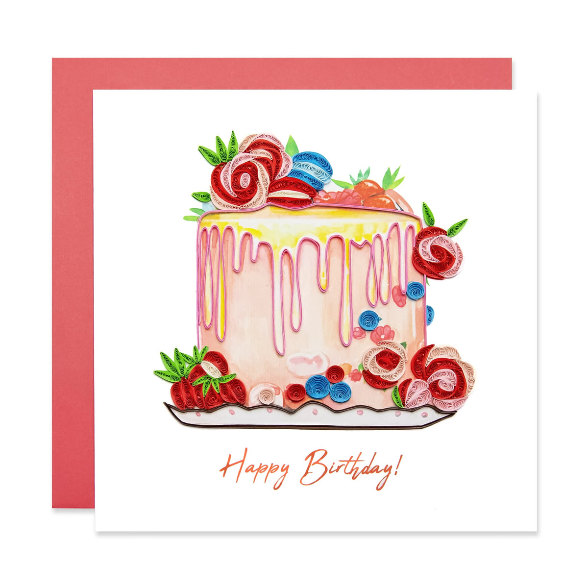 Product features a white greeting card with a large birthday cake in the center of it. The cake is covered in pink and yellow frosting, with strawberries and blueberries dotting the top and sides of the cake, as well as the platter the cake is sitting on. The berries are all made with quilling paper swirls, and the cake and frosting are outlined with paper lines. Beneath the cake the words “Happy Birthday!” are written in cursive script with red ink.
