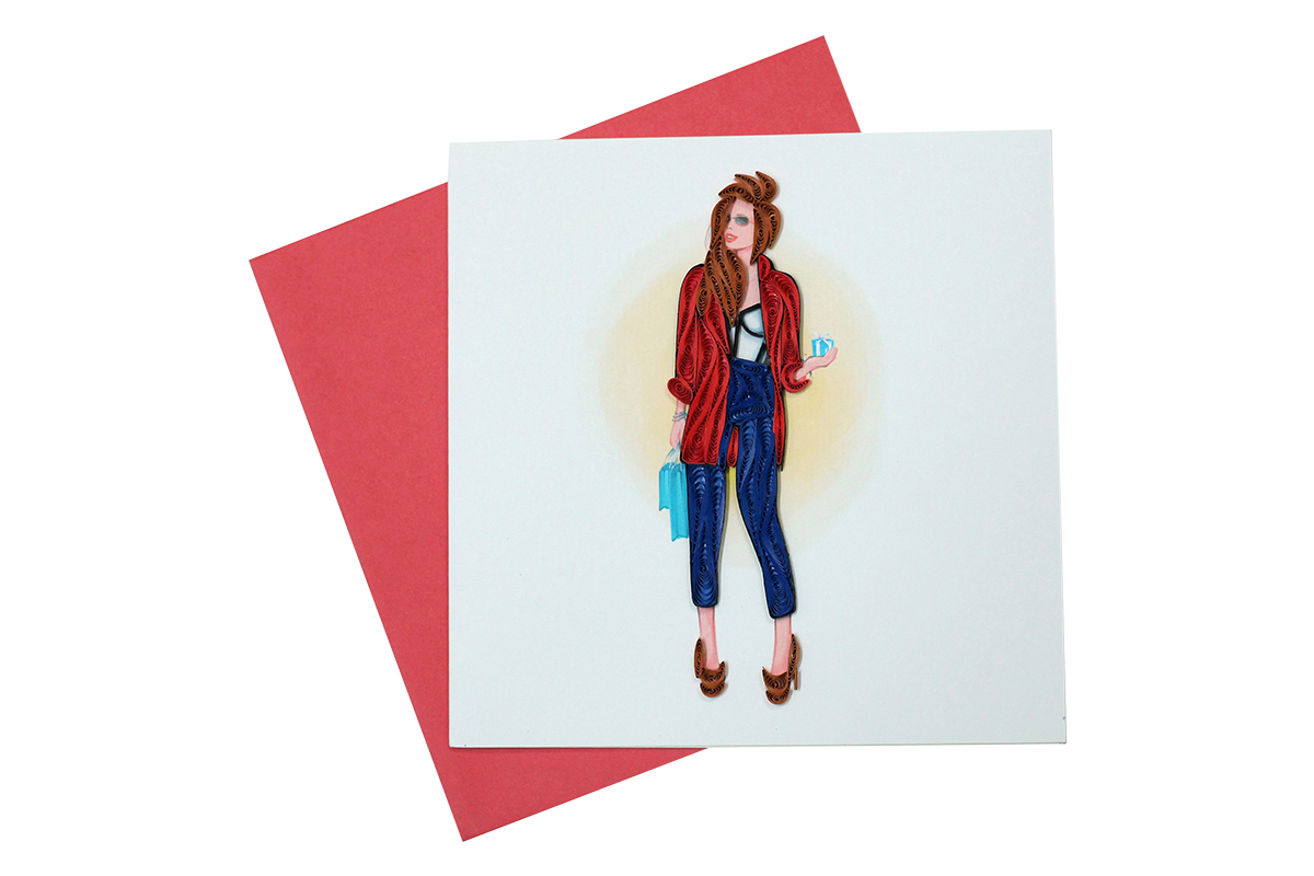 Product features a lone woman standing in the center of a white greeting card. She is light skinned and has long, light brown hair that falls over half of her face. She is wearing a light red jacket, white and black top underneath, and dark blue denim with light brown heels. She has some light blue bags in one hand and a light blue and white gift box in the other. The woman’s hair and outfit are all made with pleated and folded quilling paper.