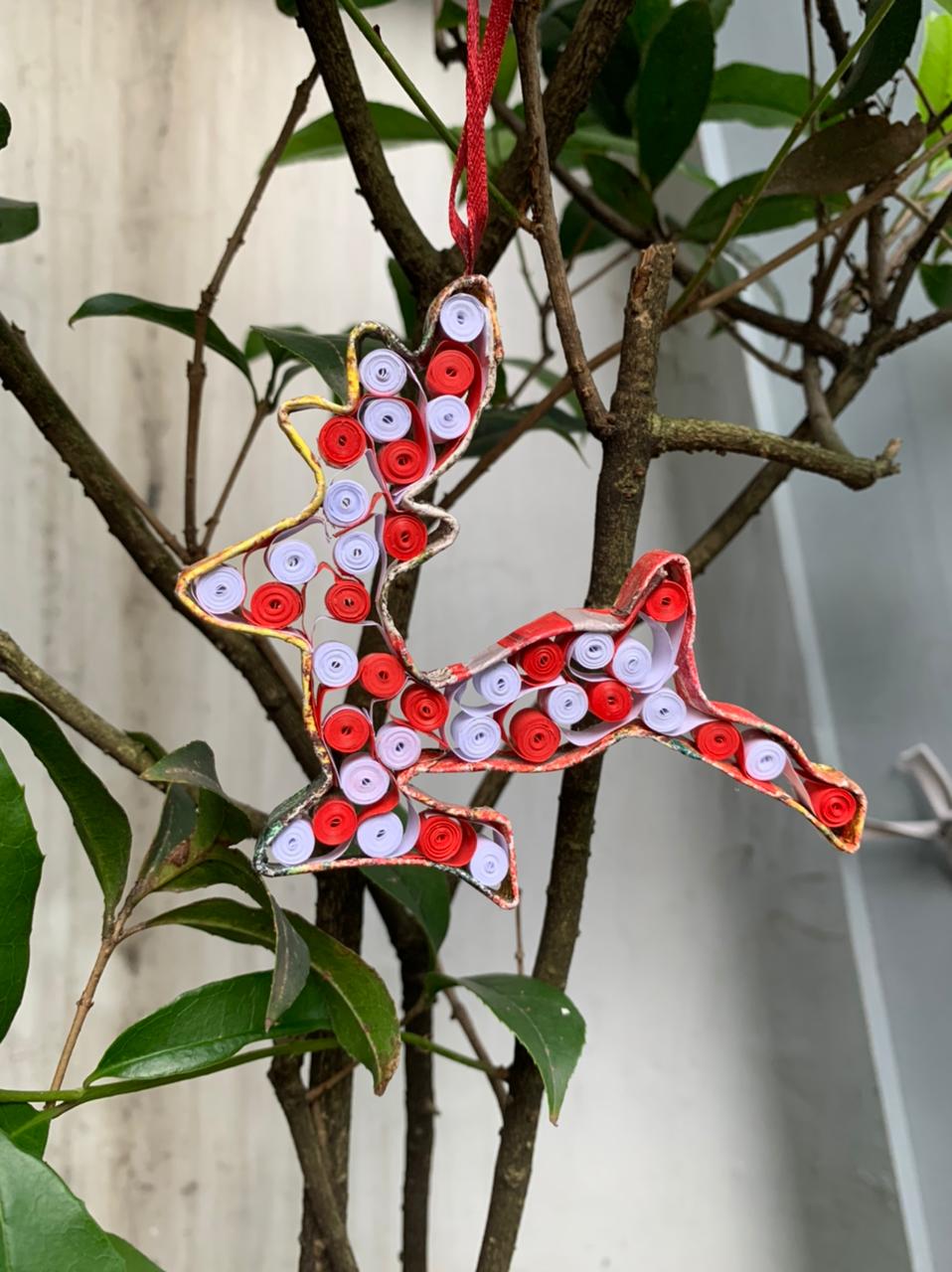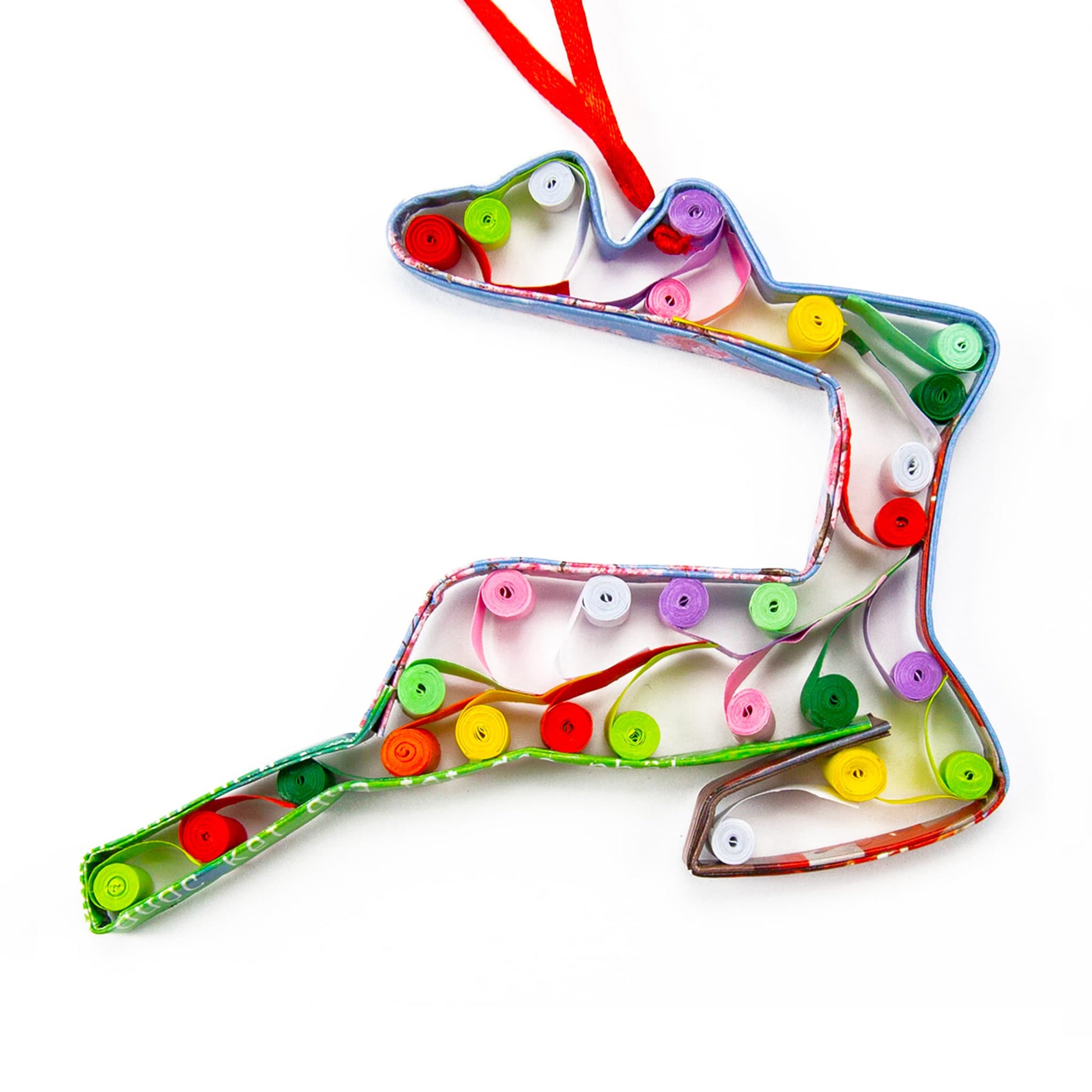 Product features a reindeer mid-leap. Its back legs are outstretched, its front legs are tucked under its body, its head is held high. The ornament is made from recycled magazine paper folded and shaped into the outline of a reindeer, while the interior is filled with small swirling circles of different colored paper. These ornaments use recycled material, and so are always slightly different from each other.