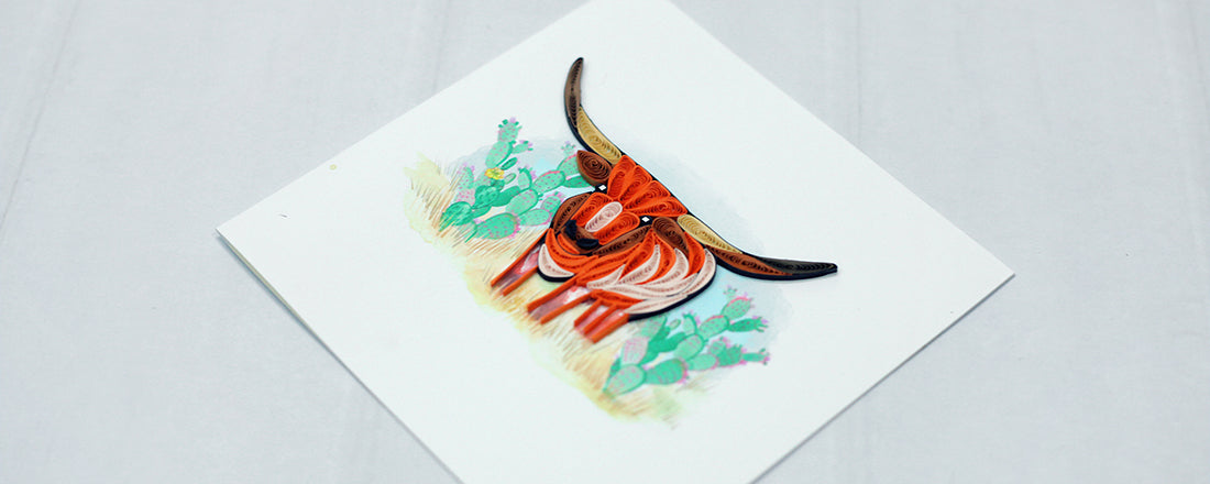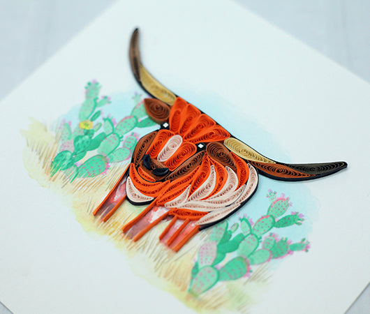Product features a white greeting card with a Long Horn steer in the center and flanked on the left and right by cactus plants and prairie grass. The bull is made primarily from light brown quilling paper with white accents. Its horns are made with light and dark brown quilling paper.