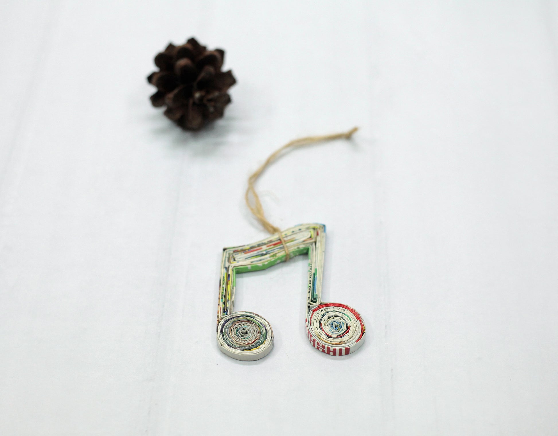 Product features a pair of eighth notes connected by a thick bar, all made from recycled magazine paper. The bottoms of the notes are made from tightly wound circles, while the connecting bars are made from flat layers of paper pressed together. The notes are turned to the left when viewed from the front. As these products are made from recycled materials, their colors will always be slightly different from each other.