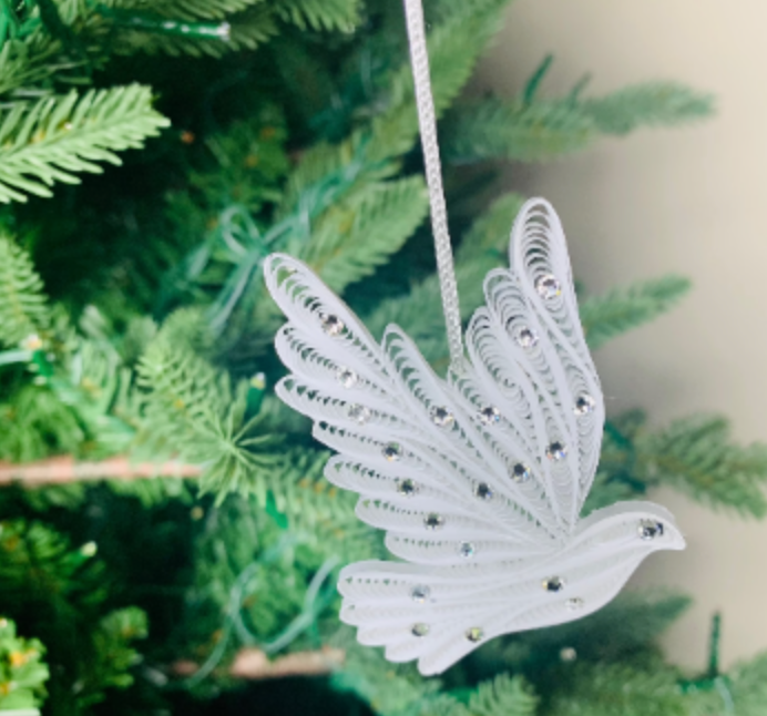 Product features solid white quilling paper shaped like a dove with wings outstretched for flight. Genuine Austria crystals dot the ornament and glitter in the light.