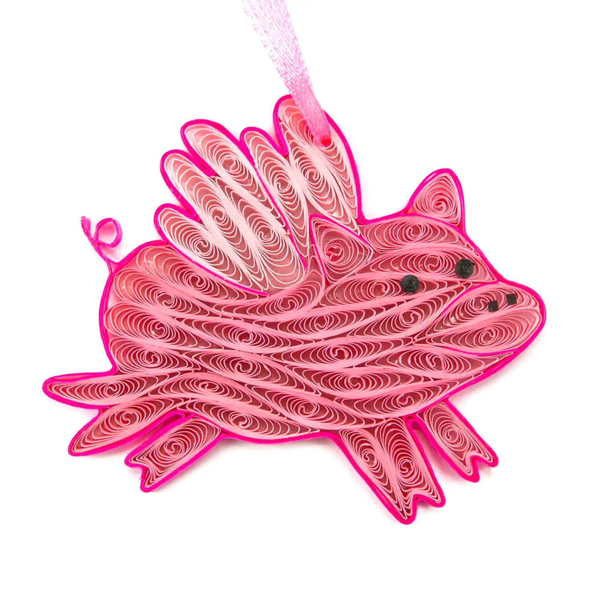 Product features a pig made from bright pink quilling paper, with light pink, feathery wings growing out of its back.