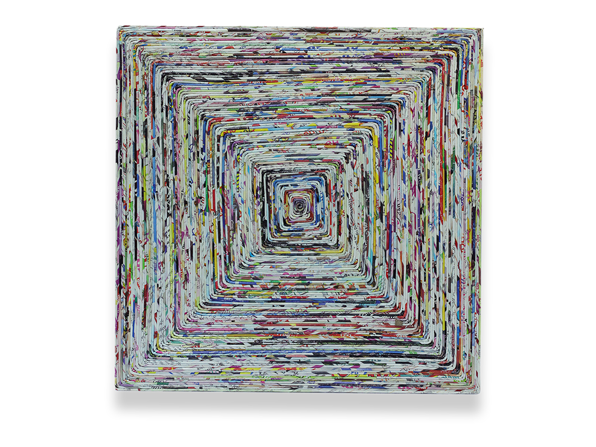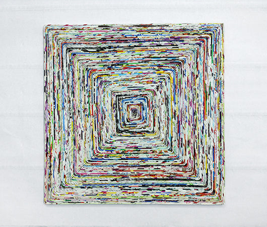 Product features a mat made from recycled magazine paper. The paper strips are layered together to make a wide square. As these products are made from recycled materials, they will always look slightly different from each other.