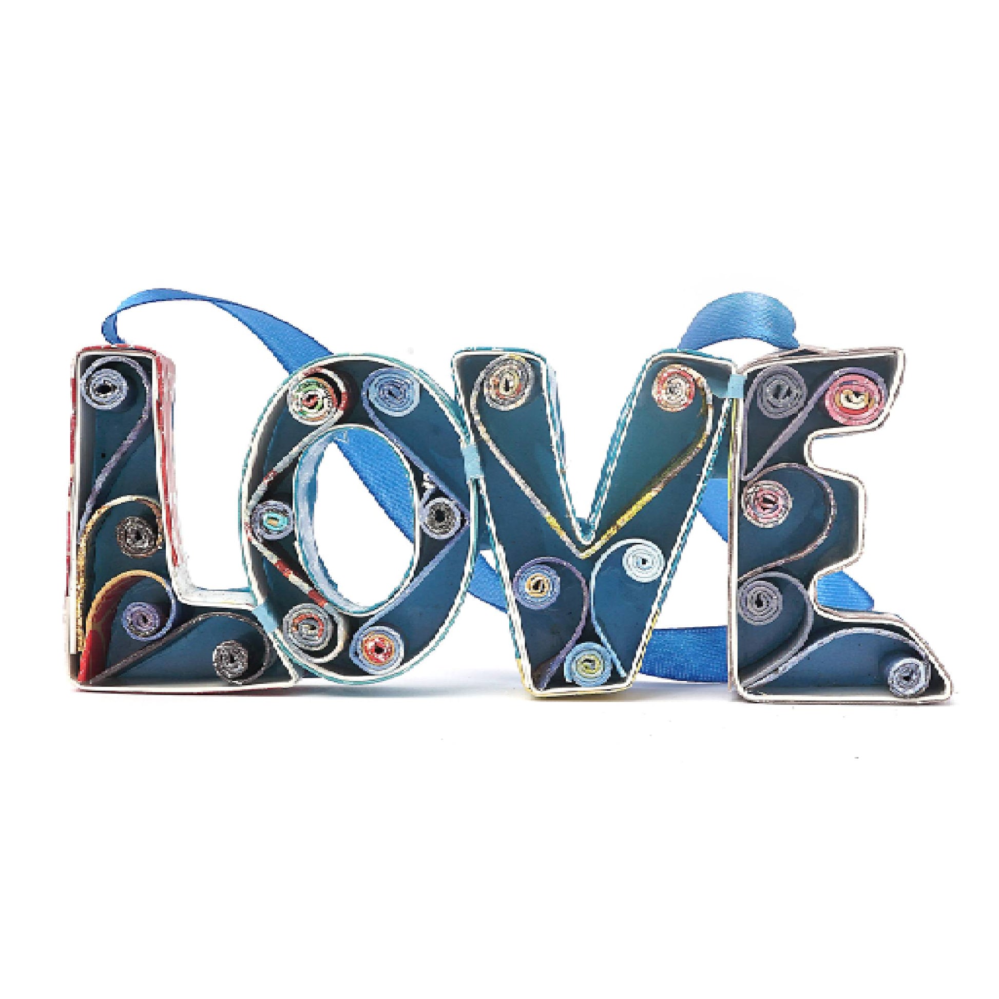 Product features an ornament made from recycled magazine paper that spells out the word “love.” The letters are made in a blocky script and have swirling decorative accents inside. As these products are made from recycled materials, their colors will always be slightly different from each other.