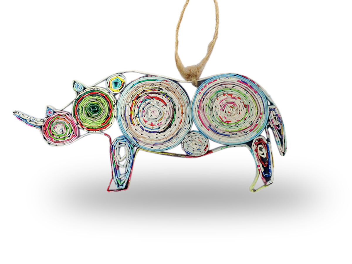 Product features a rhinoceros made from recycled magazine paper arranged in swirling patterns. As these items are handmade, their colors will always look slightly different from each other.