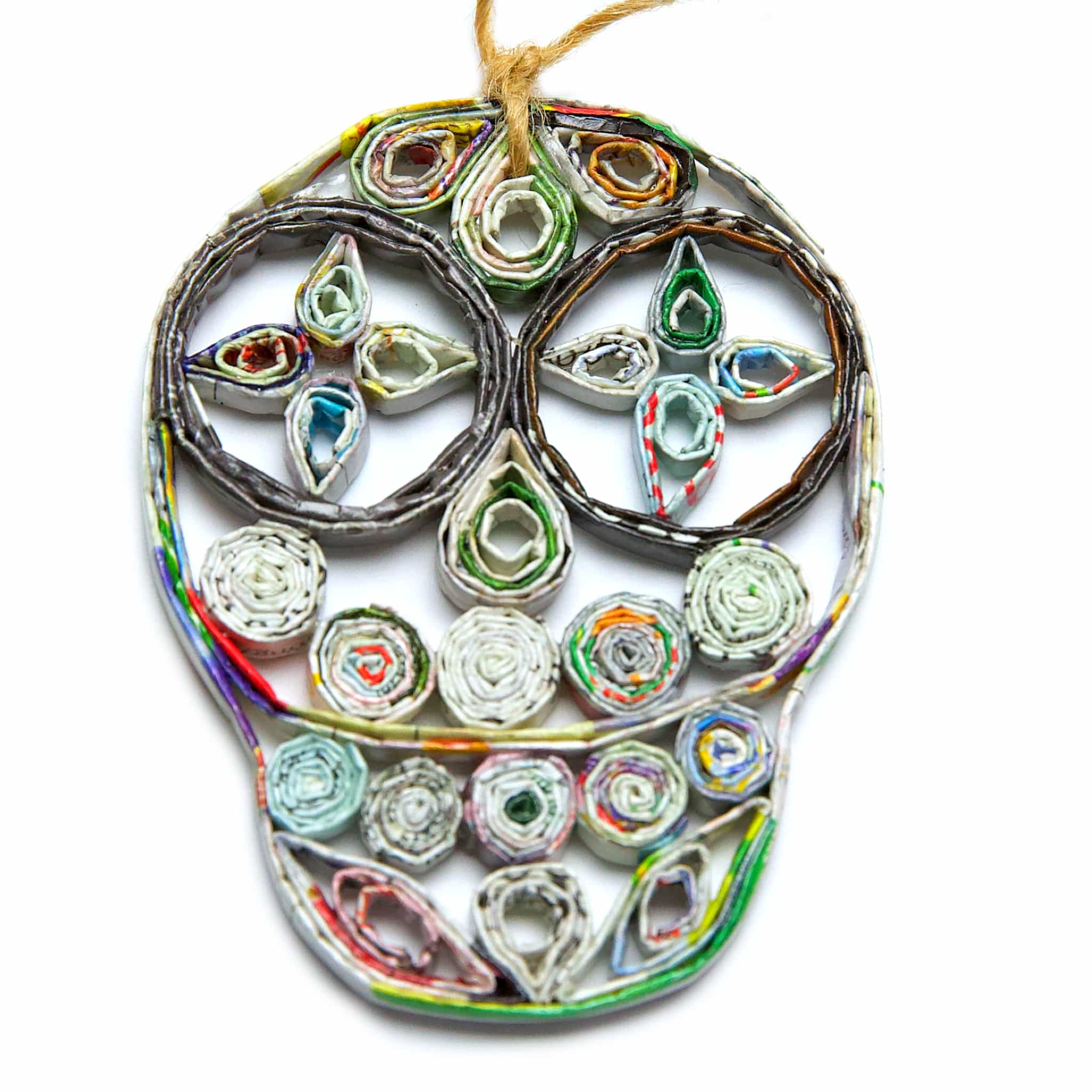Product features a skull shape made from recycled magazine paper and resembles the design of a traditional Mexican sugar skull. The skull’s features are made with tightly coiled paper shapes arranged inside an outline - the mouth is made from circles placed beside each other, while the nose is made from a teardrop shape. The eyes are large empty circles with a quartet of teardrops forming diamond-shaped pupils in each eye. The forehead and chin both have diamond and teardrop shaped accents. As these products are made from recycled material, they will always look slightly different from each other.