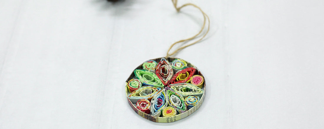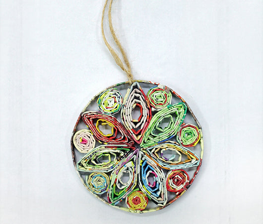 Product features a snowflake shape suspended within a circle, all made from recycled magazine paper. The snowflake has seven diamond shapes that meet in the center of the ornament and reach outwards. Between each of the points is a tightly coiled circular accent. As these products are made from recycled material, they will always look slightly different from each other.