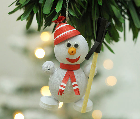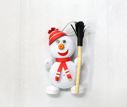 Product features a snowman made from tightly coiled paper. The snowman is holding a broomstick in one hand and has a red and white scarf and hat. An orange nose, red mouth, and small google eyes complete the snowman’s accent pieces.