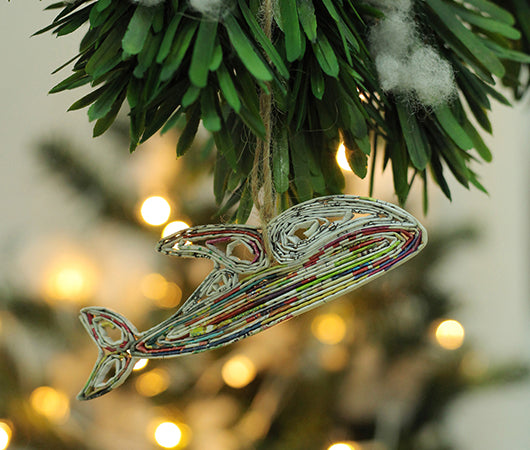 Product features a whale shape made from recycled magazine paper. The interior of the whale is filled in with pressed lines of paper and teardrop shapes in the tail and fin. As these products are made from recycled materials, they will always look slightly different from each other.
