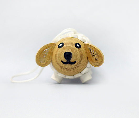 Product features a three-dimensional sheep made from quilling paper. The body and feet are shaped from multiple tight coils of white paper, while the face and ears are made from light brown. The sheep has a black paper mouth and black and white paper eyes.